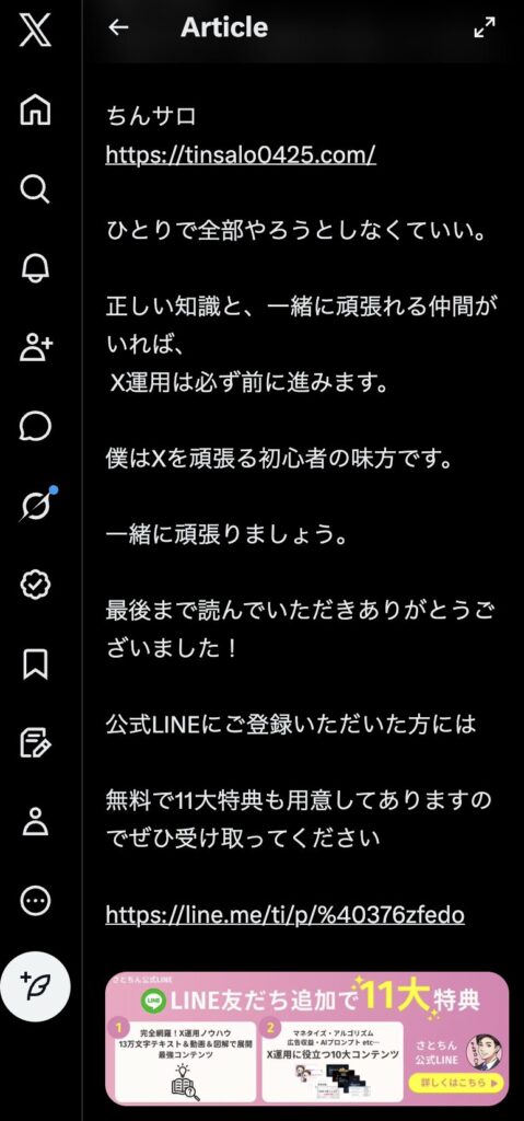 実際に僕(さとちん)も、記事投稿で公式LINEへ案内しています。短文ポストでは伝えきれない濃い内容を伝えられ、CVを狙えるのがX記事の最大のメリットです。