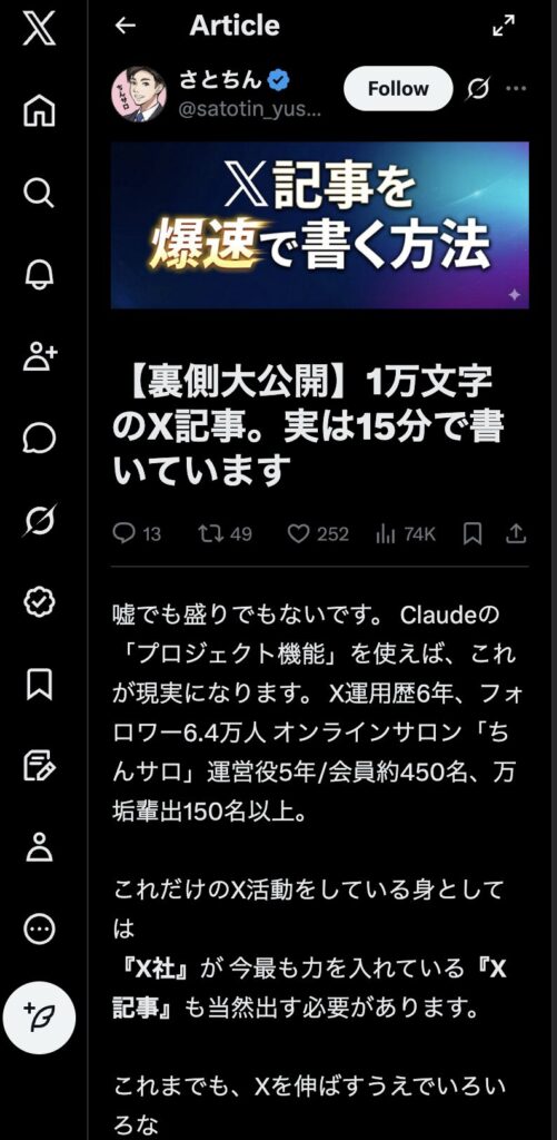 本記事では、X運用歴6年、フォロワー6.4万人、 オンラインサロン「ちんサロ」会員約450名。 さらに11アカウントのコンサル運用代行もしている僕(さとちん)が、X記事のメリットやマル秘テクニックを特別に紹介します。