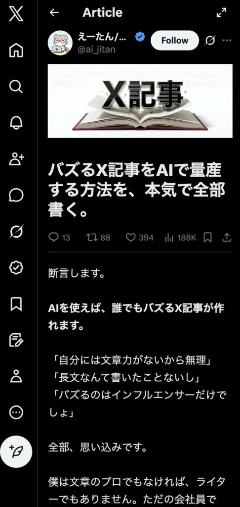 AIを使いながらX記事を執筆して、積極的に引用ポストをするのがおすすめです。X記事をうまく活用して、アカウントを伸ばしましょう。